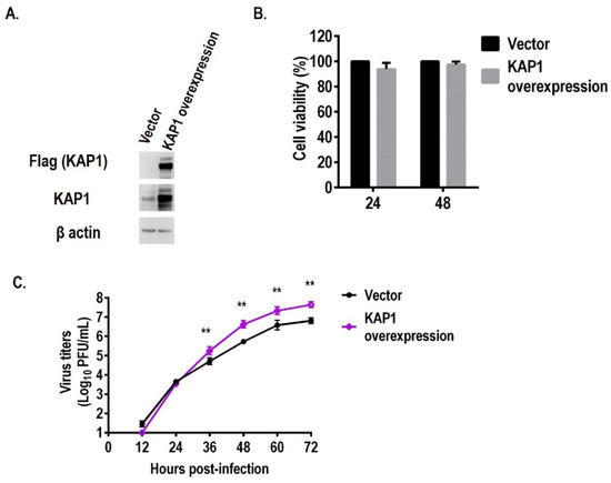 To further confirm the above results, we constructed the KAP1 stably expression A549 cells. The expression level of KAP1 in A549 cells was higher than that in vector-control A549 cells confirmed by Western blotting (Figure 3A). The virus titers in KAP1-overexpression A549 cells were also higher than that in vector-control A549 cells at 36, 48, 60, and 72 hpi (e.g., 105.24 pfu/mL VS 104.52 pfu/mL at 36 hpi) while the cell viability of these two kinds of A549 cells were similar (Figure 3B,C). These results demonstrate that KAP1 is a pro-viral host factor of influenza A virus in A549 cells.