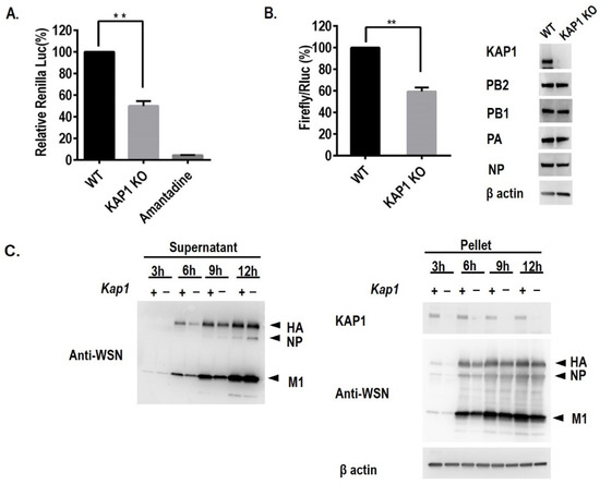 To examine whether KAP1 is involved in the early step of influenza virus replication, we used a replication-incompetent PB2-knockout WSN virus (PB2-KO/Rluc virus), whose PB2 gene has been replaced with that of the Renilla luciferase reporter protein, as described previously [25]. As this virus lacks a functional PB2 gene, Renilla luciferase expression is indicative of viral infectivity. WT and KAP1 KO A549 cells were infected with PB2-KO/Rluc virus at an MOI of 1 to make sure most of the cells were infected and reflect the effect on the early steps in viral replication in one viral life cycles. Amantadine was used as a positive control because it inhibits viral HA-mediated membrane fusion [27]. Renilla luciferase activity was measured at 8 h post-infection (hpi). Lack of KAP1 expression and amantadine treatment resulted in a significant reduction of Renilla luciferase activity (Figure 5A). The activity of Renilla luciferase activity in KAP1 KO A549 cells was reduced by 50–60% compared with that in WT A549 cells. This result demonstrated that KAP1 positively modulates the early steps of the influenza virus life cycle.