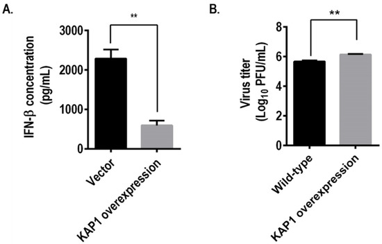 Many TRIM family members have been reported to be involved in interferon production [30,31,32,33,34]. Our precipitation experiment has shown that KAP1 interacted with NS1 protein (Figure 4), which has been demonstrated to inhibit interferon production during the infection of influenza virus [35,36]. This information prompted us to examine whether KAP1 is associated with the interferon production during influenza virus replication. To this end, we infected the vector control and KAP1 overexpression A549 cells with A/Puerto Rico/8/1934-NS1-R38AK41A (H1N1) virus at an MOI of 1, respectively, which has been reported to induce the production of the interferon previously [37,38]. And measured the amount of interferon in the medium of infected cells at 24 hpi. The result showed that the amount of interferon β was significantly decreased in the supernatant of infected KAP1 stably expression A549 cells (Figure 6A). The virus titers in the supernatant of infected KAP1 stably expression A549 cells were higher than that in vector control cells (Figure 6B). These data demonstrate that KAP1 inhibits the production of interferon during the infection of the influenza A virus.