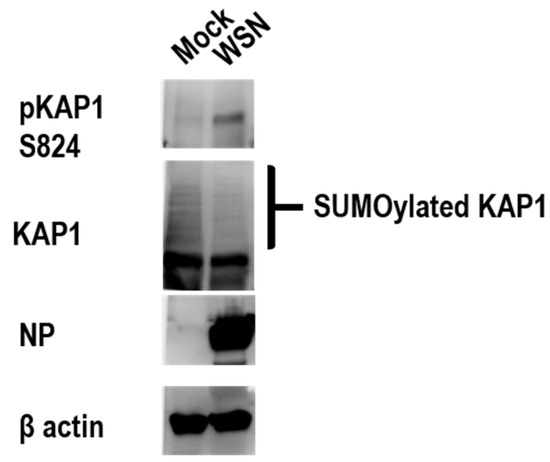 A previous study reported that KAP1 was phosphorylated during the adenovirus infection in H1299 and A549 cells [17]. So we wondered whether KAP1 was phosphorylated during the influenza virus in A549 cells. To examine this, WT A549 cells were infected with the WSN virus at an MOI of 10 to ensure that the virus can infect every cell and further affect the posttranslational modification of KAP1 during the one viral life cycle, and the cells were harvested at 12 h post-infection and subjected to Western blotting. The result showed that the total KAP1 protein was comparable between mock and virus-infected A549 cells; in contrast, the phosphorylated KAP1 was increased after WSN virus infection (Figure 7). At the same time, we found that the SUMOylation of KAP1 was decreased after WSN virus infection (Figure 7). This indicated that the influenza infection induced the KAP1 deSUMOylation and phosphorylation switch.