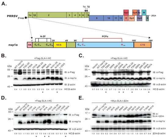 Identification of residues critical for PRRSV nsp1α-mediated degradation of SLA-I. (A) structure organization of the PRRSV genome and nsp1α; (B–E) screening of nsp1α residues necessary for SLA-I degradation by co-transfection assay. HEK 293T cells were transfected to express FLAG-SLA-I-HC (B–D) or Myc-β2m (E) in combination with HA-nsp1α or its mutants. At 36 h post-transfection, the cells were subject to Western blot analysis with antibodies to FLAG, SLA-I-β2m, nsp1α, or β-actin. Asterisk (*) indicates the mutants that were selected for further analysis. The data are representative of results from three independent experiments. The relative abundance of SLA-I was normalized against β-actin, and the ratio is shown at the bottom of the blots.