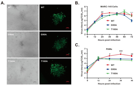 Growth kinetics of the rescued viruses. (A) MARC-145 cells were infected with indicated viruses at an MOI of 0.1 for 48 h. The left panel shows virus-induced CPE, and the right panel shows the IFA staining of virus-infected cells with an antibody to PRRSV N protein. The representative images were taken by an inverted Nikon microscope. (B,C) Growth kinetics of the rescued viruses in MARC-145 cells (B) and PAMs (C) at an MOI of 0.1. The total viruses were titrated in MARC-145 cells by an endpoint dilution assay. Asterisks indicate a significant difference in the virus titers between WT and G90A (** p < 0.01; *** p < 0.001). Pound symbols (#) represent a significant difference in the virus titers between WT and T160A (# p < 0.05; ## p < 0.01; ### p < 0.001). The data are shown as the mean ± SD of three independent experiments.