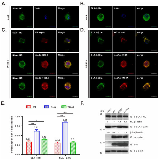 Co-localization analysis of SLA-I with nsp1α or its derivatives in PRRSV-infected PAMs. PAMs grown on coverslips in 12-well plates were mock-infected with RPMI 1640 (A,B) or infected with the indicated viruses (C,D) at an MOI of 1.0. At 12 h post-infection, the cells were fixed, permeabilized, and stained with antibodies to SLA-I-HC, SLA-I-β2m, or nsp1α. DAPI was used to stain the cell nuclei. (E) The same as above, except that the co-localization relationship was quantified. The graph shows the percentages of cells that exhibited a non-colocalization relationship between nsp1α or its mutants with SLA-I molecules (averages are shown on top of each bar). Asterisks indicate a statistical significance between the WT and the mutants (* p < 0.05; *** p < 0.001). NS means no significance. The data are shown as the mean ± SD of three independent experiments. (F) Western blot analysis of SLA-I abundance in PAMs infected with the indicated viruses (MOI = 1.0) at 12 h post-infection.