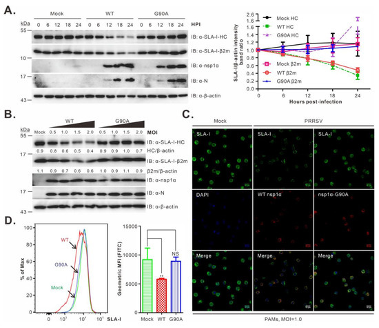 We next investigated the decay of SLA-I in a time-course study. The mutant G90A was chosen for further analysis, as the corresponding mutation exhibited a stronger inhibitory effect on nsp1α activity (Figure 1D,E and Figure 4C,D,F). PAMs were either mock-infected or infected with WT or the mutant G90A at an MOI of 1.0. At different time points post-infection as indicated, the cells were collected and subjected to Western blot analysis. In WT PRRSV-infected cells, a gradual decline in SLA-I-HC was exhibited as the infection progressed, and this became obvious at 12 h post-infection and pronounced at later time points (Figure 5A). A similar trend was observed for SLA-I-β2m (Figure 5A). In contrast, in the cells infected with the mutant G90A, the levels of SLA-I were kept steady (Figure 5A). Moreover, an increase in the infection doses (MOI = 0.5, 1.0, 1.5, or 2.0) did not change the outcome (Figure 5B).