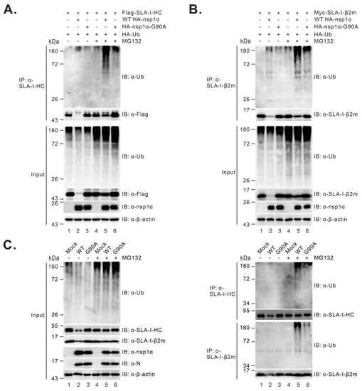The effect of the G90A mutation on nsp1α-induced SLA-I ubiquitination. (A,B) HEK 293T cells were co-transfected to express FLAG-SLA-I-HC (A) or Myc-β2m (B), HA-ubiquitin with or without WT HA-nsp1α or HA-nsp1α-G90A. At 18-24 h post-transfection, the cells were treated with treated with MG132 at a final concentration of 10 μM for 4 h before Co-IP and Western blot analyses with indicated antibodies. β-actin served as a loading control. (C) PAMs were mock-infected with RPMI 1640 or infected with 1.0 MOI of the WT or G90A. At 4–6 h post-infection, the cells were treated with 5 μM MG132 for another 8 h before Co-IP and Western blot analyses with the indicated antibodies.