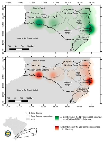Distribution of sequenced SARS-CoV-2 genomes in Santa Catarina from 1st March 2020 to 30th April 2021. Map showing the Santa Catarina SARS-CoV-2 sequences obtained from GISAD EpiCov Database (upper map) and samples sequenced in this study (lower map).