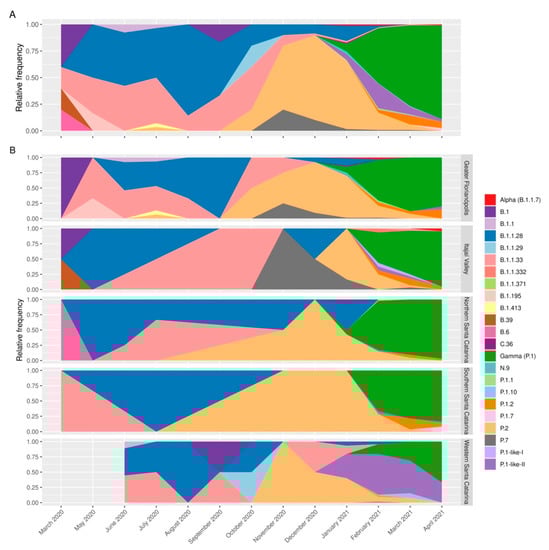 SARS-CoV-2 variant profiles in the state of Santa Catarina from March 2020 to April 2021. (A) Analysis of the variant profile considering the whole state of Santa Catarina. (B) The variant profile by Santa Catarina mesoregion. From March to September 2020, the variants identified were in the highest proportion of B.1.1.28 (blue) and B.1.1.33 (light red). From September 2020 to January 2021, the highest proportion was of P.2 variant, followed by VOC Gamma and related lineages from February to April 2021.