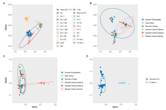 A multidimensional scale (MDS) plot shows the clustering of the SARS-CoV-2 genomes according to the mutations observed (Figure 4A). There was no clear clustering of the studied SARS-CoV-2 variants according to the sampled geographic regions along the sampling period (Figure 4B). However, in a separate analysis of the data from the VOC Gamma and the related lineages, it was possible to observe a clustering of genomes from Western SC (Figure 4C), mainly composed of the P.1-like-II variants (Figure 4D).