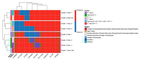 As the ML and the MDS analyses pointed out the evidence of the genetic proximity of the cluster of P.1-related lineage (P.1-like-II) in Western SC, we compared all SC VOC Gamma and related lineage sequences obtained from 7th August 2020 to 30th April 2021. These genomes were classified based on the amino acid substitutions described in P.1-like-I [36] and P.1-like-II [13] variants. Mutations that characterize each VOC Gamma-related lineage profile were identified and are summarized in Figure 5.