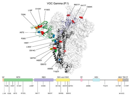 For structural analysis of the S protein of VOC Gamma, 57 presented full-length S protein coverage of VOC Gamma sequenced in this study, with 722 retrieved from GISAID (3 December 2021), including the reference sequence (NC_045512.2), were aligned using MAFFT [27]. The mutations were represented over the 3D S protein structure PDB 6ZGG (resolution 3.8 Å). The experimental structure presents a representative coverage of the N-terminal domain (NTD) (Gln14 to Asp1146). The mutations were highlighted and colored according to the observed frequencies and built with PyMOL version 2.3.3 software [35].