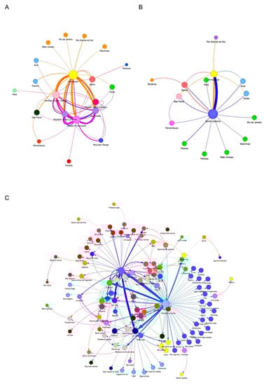 Network analysis of VOC Gamma and related lineages sequenced in the state of Santa Catarina, Brazil, from 3rd January 2020 to 30th April 2021 with the other Brazilian states. The ML analysis was performed on 13,018 Brazilian VOC Gamma-related genomes obtained from GISAID until 30th April 2021 and submitted to StrainHub [34] analysis considering the closeness parameter. The sizes of the nodes are scaled by the closeness metric and the arrows reflect the directionality of possible transmissions among the Brazilian states (A), Santa Catarina mesoregions (B), and Santa Catarina cities (C). The thickness of the lines and arrows represents the frequency of putative transmissions.