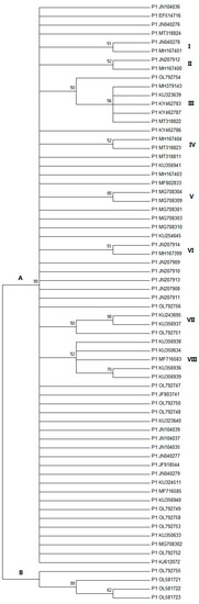 A total of 96 P1 strains were obtained, but the number was reduced to 68 after redundancy analysis. The P1 genome size range is 647–649 nucleotides. The neighbor-joining phylogenetic tree created from the complete genomic nucleotide sequences clustered the P1 strains into two phylogroups: A (n = 64) and B (n = 4). Group A is the dominant, most prevalent genotype. Phylogroup A has 648 (or 647) nt, while phylogroup B has 649 nt. Phylogroup A, including a P1 strain with 647 nt (MG708302), has a nucleotide deletion corresponding to position 207 within the VP1 gene of phylogroup B. The translation of the VP1 gene mainly produced a protein of 114 (or 122) amino acids in phylogroup A and 163 amino acids in phylogroup B. Phylogroup A has at least eight subgroups (I-VIII), while the majority of strains did not cluster with any subgroup (Figure 1).
