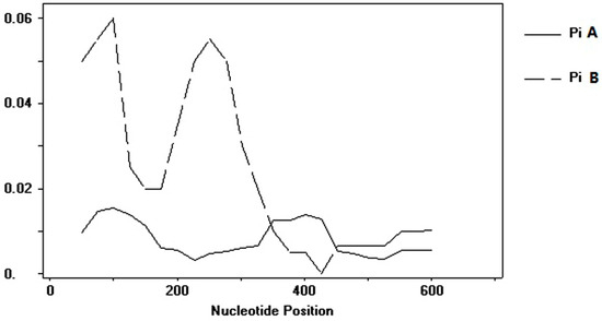 Nucleotide diversity in P1 virus genome. A window size of 100 bp and a step size of 25 bp were used. Group A is presented by broken lines, and B by straight lines.