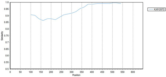 In addition, a similarity plot analysis was carried out with putative parental sequences using SimPlot software to corroborate the results obtained using the RDP4 software. Taking the strain OL581722 as an example, the similarity plot indicated that the recombinant presented a nucleotide similarity with a P1 strain (KJ612072) between nucleotides 380 and 540 (Figure 3).