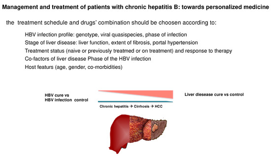 Virologic and clinical characteristics, that should guide the therapeutic choice in chronic hepatitis B patients to grant a personalized approach with both the currently available and the new drugs. The functional cure with a finite treatment should be pursued primarily in young patients with chronic hepatitis, whereas in older patients with cirrhosis the persistent inhibition of both viral replication and disease activity is a reasonable goal of antiviral therapy, as it was shown to stop/reduce the progression to end stage liver disease complications. An accurate characterization of the HBV infection profile and of its evolution overtime, together with the treatment history of the patient will further guide the selection for each patient of the most appropriate treatment strategy, particularly when new antiviral and immune modulatory drugs will be available.
