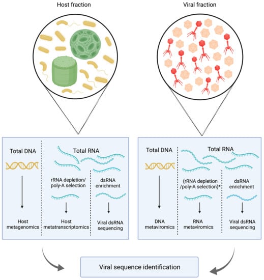 Metatranscriptomics, which is the sequencing of RNA transcripts from environmental microbial communities, is well suited to study the active viral infection in diverse viral groups with structurally different genomes (Table 1; Figure 3). As a part of the infection cycle, all seven Baltimore classes of viruses produce mRNA intermediate inside infected cells and can be simultaneously captured by metatranscriptomics [,]. The additional benefit of this approach is detection of RNA viruses that lack capsid and extracellular stages and are therefore absent from the viral particle fraction, such as Narnaviridae, Hypoviridae, and Endornaviridae [,,]. The main preparations steps include (i) RNA extraction from cells collected on a filter, (ii) DNase treatment to remove the contaminating cellular DNA, and (iii) cellular mRNA enrichment by depletion of highly abundant ribosomal RNAs or by selection of polyadenylated RNA before the library preparation and sequencing. Ribosomal RNA is typically captured by complimentary probes bound to magnetic beads, while polyadenylated RNA is typically selected by binding to oligo-dT probes [,]. The removal of ribosomal RNA is a less selective process because it retains all nonpolyadenylated and adenylated cellular RNA. In the context of viruses, this means that with rRNA depletion, RNA viruses that lack a poly-A tail and fragmented or degraded viral RNA genomes can be included in the sample, while during poly-A selection, only RNA viruses (and cellular mRNA) with intact poly-A tail will be retained. This is supported by a recent study demonstrating that rRNA-depleted libraries produced more viral reads, longer contigs, and greater viral richness compared to poly-A-selected libraries []. While these results will require additional experimental confirmation as different filter sizes were used for the two treatments, potentially biasing the data, similar results were observed in metatranscriptomes of marine invertebrates []. Limitations of this method include a high abundance of rRNA reads in the metatranscriptomes of cellular fractions even after the enrichment steps [,] and the fact that the majority of non-rRNA sequences in the cellular metatranscriptomes are of host origin, while viral reads typically constitute less than 1% of the sequenced reads (Table 2 and the references there).