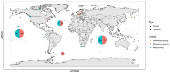Geographic locations of aquatic metaviromic (blue), metatranscriptomic (coral), and dsRNA sequencing (yellow) studies focusing on RNA viruses reviewed in this paper. Spatially focused studies are represented with circles, and temporally focused studies are represented with triangles. Two global surveys with extensive geographic coverage, Dayang No. 1 cruises and Tara Oceans Expedition [,], are represented by large bubbles in each of the five oceans. The size of the bubble is proportional to the total number of samples collected from each ocean, with numbers of benthic virome samples from the Dayang No. 1 cruises [] indicated in blue, and number of pelagic metatranscriptome samples from the Tara Oceans Expedition [] in coral. Samples from the Mediterranean Sea were included in the counts of the Atlantic Ocean.