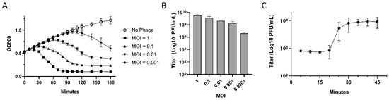 One-step growth curve experiments were performed as previously described [25]. Briefly, 1 mL of 5 × 106 PFU/mL EPr2 stock was mixed with 1 mL of mid-log phase bacterial culture in HIB and allowed to adsorb for 5 min at 37 °C. The mixture was then diluted with fresh HIB and incubated at 37 °C for the duration of the experiment. Samples were taken every 5 min and plated using the double-layer agar plate method to determine phage titer. Experiments were repeated independently three times and analyzed using GraphPad Prism v. 9 (GraphPad Software, San Diego, CA, USA).