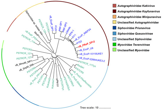 Phylogenetic tree of Providencia phage EPr2. A whole-genome average nucleotide distance tree was constructed for 40 total phage genomes (22 phages that infect Providencia species (green leaves), 5 phages related to known Providencia phages (black leaves), 12 with top BLASTn matches (blue leaves) and vB_PReP_EPr2 (bold red leaf) with MASH [30] (sketch size of s = 5000, k-mer size of k = 12 and GGRaSP [31] (see Supplementary Materials and Methods). Color strips denote taxonomic assignments (see key). The scale bar represents percent average nucleotide divergence.