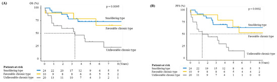 The 4-year PFS in the smoldering and favorable chronic-type ATL groups was 70% and 79%, respectively. The 4-year PFS rate in the unfavorable chronic-type ATL group was 29%, which was worse than that in the smoldering- and favorable chronic-type ATL (p = 0.0002) groups (Figure 1B).