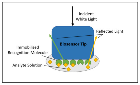 BLI systems are characterized by disposable biosensors that have a layer of the recognition molecule immobilized on the sensor tip, as Figure 2 shows [13,14,15]. The biosensor tip can then be dipped into wells containing the analyte solution, where binding of the analyte molecule to the recognition molecule is measured as disturbances to the interference pattern of white light that is directed down the length of the biosensor. The light is reflected off two surfaces—a ligand-binding surface and a stationary surface—where the binding event causes a shift in the wavelength of light that is proportional to the optical depth of the binding surface, which is detected and reported [14,15]. BLI is advantageous in comparison to SPR in its simplicity of dipping biosensors as opposed to using flow channels. This in turn makes the apparatus less expensive when compared to the SPR setup, with the added advantage of higher throughput potential [14].