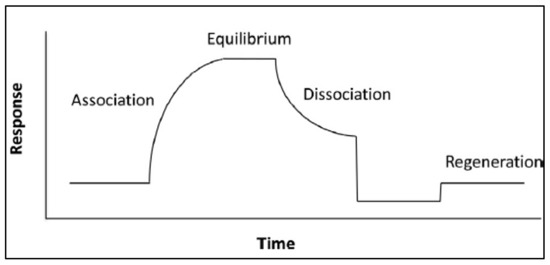 Theoretical sensorgram. Reprinted from the Journal of Pharmaceutical and Biomedical Analysis, Vol. 113, Zheng, X., Bi, C., Li, Z., Podariu, M., Hage, D.S. [10], Analytical methods for kinetic studies of biological interactions: A Review, p. 168, (2015), with permission from Elsevier.