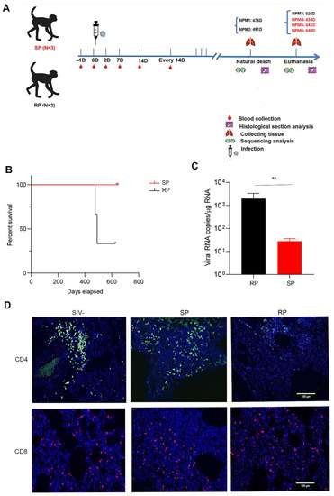 Viral load and changes in T cells in the lungs during chronic infection. (A) Schematic of the study. Blood samples were collected twice in the first week after infection, once in the second week after infection, and once every 14 days for the remainder of the time. The animals that died naturally were dissected immediately, and lung tissue was collected. The other animals were euthanized. SP: n = 3, RP: n = 3. (B) Survival curves of the two groups. (C) Viral load in the lungs. (D) Changes in T lymphocytes in the lungs before and after infection with SIVmac239 (blue: DAPI; green: CD4; red: CD8). Representative figures were selected randomly. Slow progressors/SP: n = 3, Rapid progressors/RP: n = 3, Healthy/SIV-: n = 4. The bars and error bars indicate the means ± SEMs. Paired t tests were used to compare groups. ** p < 0.01.
