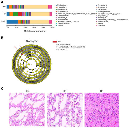 Changes in microbial flora in the lungs during primary infection with SIVmac239. (A) The relative abundance of flora in the lungs of the SP, RP, and healthy groups. The bar graph shows only the top 20 species at the abundance level and merges other species into “Others”. “Unknown” represents species that have not been taxonomically annotated, and the different colors represent different flora. (B) Cladogram from LEfSe analysis. The circles radiating from the inside to the outside represent the classification levels of the microbes from phylum to species (g: genus; s: species; f: family); each small circle at the different classification levels represents a classification at this level, and the diameter of the small circle is proportional to the relative abundance. Species without significant differences are uniformly colored yellow, and other species with significant differences are colored red. (C) HE staining of lungs. Representative figures were selected randomly. SP: n = 3, RP: n = 3, SIV-: n = 4.
