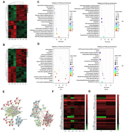 To further determine the reasons for the stability of pulmonary microorganisms in the lungs of SP group, we performed transcriptome sequencing of infected and healthy lung tissues. Based on pulmonary RNA samples from 4 healthy NPMs, 3 RPs, and 3 SPs, we established 10 cDNA libraries to carry out transcriptome analysis. We compared the gene expression of the SP group and the RP group with that of the healthy group to identify the differentially expressed genes (DEGs). By screening the DEGs, we found that there were 53 upregulated genes and 58 downregulated genes in the SP group and 69 upregulated genes and 61 downregulated genes in the RP group compared with the healthy group (Figure 3A,B and Figure S3).