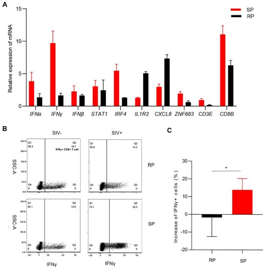 Confirmation of the expression of several DEGs. (A) Determination of DEGs expression by real-time PCR in the lungs. Changes (B) and quantitative analysis (C) of IFNγ+ CD8+ T cells after infection in PBMCs. The Q2 gate represents IFNγ+ CD8+ T cells. The bars and error bars indicate the means ± SEMs. Paired t tests were used to compare groups. * p < 0.05. RP: n = 3; SP: n = 3; SIV-: n = 4.