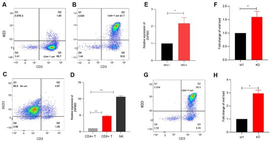 Based on the previous results obtained with the SIV infection animal model, we continued to study the function of ZNF683 in HIV patients. We isolated CD4+ T cells, CD8+ T cells, and NK cells from human PBMCs (Figure 6A–C). Consistent with other reports, ZNF683 was highly expressed in CD8+ T cells in humans (Figure 6D).