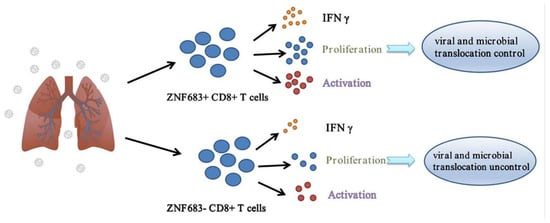 ZNF683 is a transcription factor that can enhance immunity by immediately promoting lymphocyte activation. It is a homolog of blimp-1 in T cells that mediates a transcriptional program in various innate and adaptive immune cell types, such as tissue-resident memory T (Trm) and natural killer T (NKT) cells. Human ZNF683 was uniformly expressed in effector-type CD8+ T cells but not in naive CD8+ T cells or in most memory CD8+ T cells and was strongly correlated with T-bet and IFNγ expression within the CD8+ T cell population. Notably, ZNF683 is necessary for IFNγ production after human cytomegalovirus infection [29]. However, its role and correlation with HIV infection have not been studied [30].
