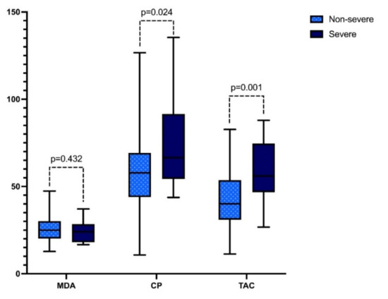Pregnant women with severe COVID-19 had an increase of 15% in the levels of carbonylated proteins (5782 pmol vs. 6651 pmol; p = 0.024) and of 39.9% in the total antioxidant capacity (40.1 pmol vs. 56.1 pmol; p = 0.001), whereas no differences were observed in MDA levels (Figure 1).