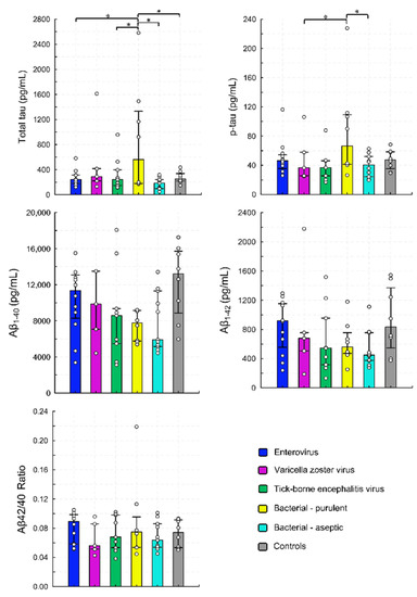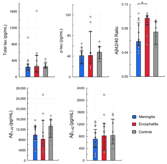 Cerebrospinal fluid concentrations of biomarkers of Alzheimer’s disease in children with infections of the central nervous system. Bars represent medians, whiskers represent interquartile range, and dots show the raw data. * indicates p < 0.05.