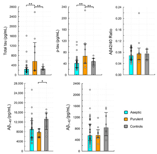 Cerebrospinal fluid concentrations of biomarkers of Alzheimer’s disease in children with infections of the central nervous system, divided by the type of infection. The aseptic group comprises children with viral infections of the CNS and children with Lyme neuroborreliosis (n = 37). The purulent group comprises children with purulent bacterial infections of the CNS (n = 8). Bars represent medians, whiskers represent interquartile range, and dots show the raw data. * indicates p < 0.05. ** indicates p < 0.01.