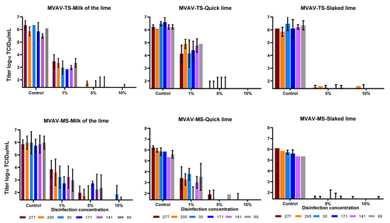 Comparison of the disinfection of MVAV with three different types of lime. Top three panels represent soil (TS) and lower three panels mineral soil (MS). The mean value and standard deviation of at least duplicate tests are shown. Virus titers were calculated by Spearman–Kaerber method. Limit of detection was 1.4 log10 TCID50/mL.