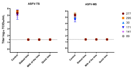 Disinfection of ASFV with three different types of lime in a concentration of 10%. The mean value and standard deviation of at least duplicate tests are shown. Virus titers were calculated by Spearman–Kaerber method. Limit of detection was 1.4 log10 TCID50/mL.