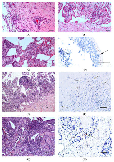 Example photomicrographs of tissue sections from the CAEV-infected goats. (A–C,E,G)—Sections stained with hematoxylin and eosin (HE); (D,F,H)—Immunohistochemical (IHC) labeling for CAEV p28 detection. (A) Brainstem, goat 5. Locally present mononuclear infiltrations around the blood vessel; (B) Choroid plexus, goat 5. Mononuclear infiltration within the choroid; (C) Lung, goat 7. Moderate interstitial pneumonia. The alveolar septa and peribronchial interstitium are widened by diffuse mononuclear infiltration and eosinophilic amorphic material; (D) Lung, goat 7. Positive CAEV p28 immunolabeling visible as brown particles in the cytoplasm of the bronchiolar epithelium (black arrows) and single macrophage-like cells (white arrows); (E) Carpal joint, goat 5. Hypertrophic synovial membrane-forming villous projections thickened by mononuclear infiltrates; (F) Carpal joint, goat 7. Positive CAEV p28 immunolabeling visible as brown particles in the cytoplasm of singular cells (arrows) within subsynovial mononuclear infiltrations; (G) Mammary gland, goat 5. Multifocal to diffuse mononuclear infiltrations around lactiferous ducts, blood vessels and within interstitial tissue; (H) Mammary gland, goat 5. Positive CAEV p28 immunolabeling in the cytoplasm of macrophage-like cells infiltrating the periacinar area; Scale bars = 50 µm.