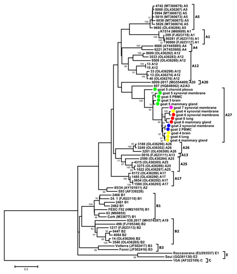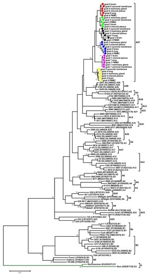 Total DNA isolated from the peripheral blood mononuclear cell (PBMC), mammary gland, lung, synovial membrane and brain of all goats were used as templates for the PCR amplification of the gag gene encoding the capsid protein. The band corresponding to the expected 625 bp PCR product was detected in all tissue samples of the animals except the lung-derived samples originating from goat 5. The obtained sequences were aligned with other published sequences representing SRLV genotypes described to date and subjected to phylogenetic analysis. The maximum-likelihood (ML) tree revealed that all analyzed sequences were closely related to each other (mean genetic distance of 4.8%) and that the sequences derived from different tissues of the same animal clustered together. The mean nucleotide distance of sequences derived from different tissues of each goat did not exceed 1.3% (ranging from 0.2% to 1.3%). Interestingly, all of the analyzed sequences formed a new cluster within group A, which could be tentatively named A27. The affiliation of the new cluster, A27, was supported with high bootstrap values ≥85 (Figure 2). The mean genetic distances between sequences forming the new subtype and sequences representing other subtypes representative of genotype A varied from 10.0% to 21.7% (Table 2). Polish SRLV A27 nucleotide sequences showed the highest nucleotide sequence identity, with strains representative of subtype A13. To evaluate the robustness of our analysis, we also performed a phylogenetic analysis using the neighbor-joining method (Supplementary Materials Figure S1), which resulted in the same classification, supporting the existence of the new subtype.