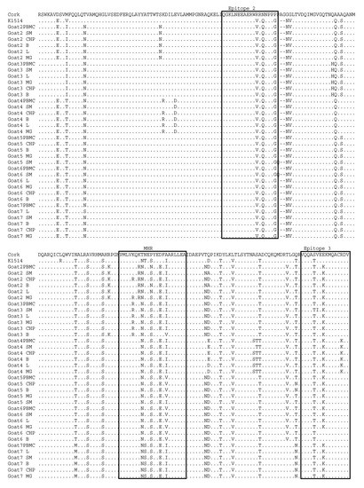 Indirect serological assays usually use the capsid protein as the antigen, so analysis of these sequences is useful for detecting antigenic variability, which may affect the sensitivity of serological tests. The primers used in this study allowed the sequencing of two major immunodominant epitopes identified by Rosati et al. [32] and the major homology region (MHR). Immunodominant epitope 2 was fully conserved in all sequences originating from different tissues of all goats, and only minor variations were found in sequences of epitope 3. This high conservation is important for the maintenance of cross-reactivity in serological tests based on Gag-derived antigen [17,33]. More alterations were observed in the major homology region (MHR), suggesting that this region is quite variable. Therefore, our results are in line with other studies demonstrating the variability of the MHR region [8,34]. No tissue-specific signature pattern was identified in the gag sequences. Most of the substitutions were specific to each animal, suggesting that these changes could have arisen as a result of long-term host–virus adaptation and evolution.
