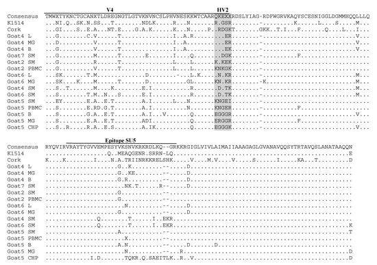 Next, the deduced amino acid sequences of the immunodominant regions of the surface glycoproteins (SU) were aligned with the corresponding reference sequences of parental strains Cork and K1514 (Figure 5). The env aa sequences obtained from the goats were more heterogeneous, showing 77.6–98.3% similarity to each other and 65.8–71.0% and 77.0–79.0% to the Cork and K1514 strains, respectively. Most of the variation was observed in the variable region (V4), especially in the highly variable region (HV2) (Figure 5). Sequences of epitope SU5 were more conserved among the sequences derived from the analyzed goats and differed prominently from the SU5 sequences of the Cork and K1514 strains and other strains representing known subtypes (Supplementary Materials Figure S2). Only the sequence originating from the choroid plexus of goat 5 differed from the sequences originating from the other goats analyzed in this study. All sequences had a perfectly conserved motif located at the N-terminus part (VRAYTYGV) and more the variable motif at the C-part.