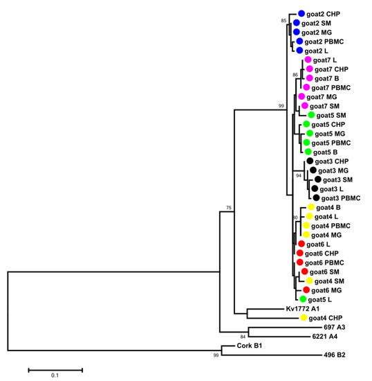Maximum-likelihood phylogenetic tree based on the alignment of the LTR fragment. Sequences from this study are labeled by black circles. Numbers at the branches indicate the percentage of bootstrap values obtained from 1000 replicates. Bootstrap values >70% are shown. PBMC—Peripheral blood mononuclear cells, L—Lung, SM—Synovial membrane, B—Brain, CHP—Choroid plexus, MG—Mammary gland, goat 2—Blue, goat 3—Black, goat 4—Yellow, goat 5—Green, goat 6—Red, goat 7—Pink.
