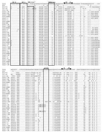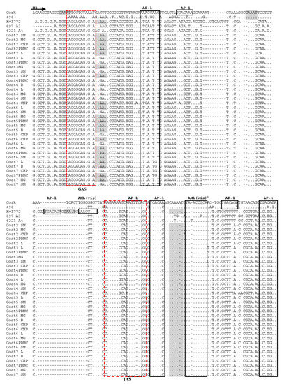 Multiple conserved motifs were identified within the LTR sequences, including AP-1 sites, AML, AP-4, TATA box, poly A, CAAAT, GAS and TAS. Sequences corresponding to the TATA box, AP-4, GAS and polyadenylation signal (poly A) were quite conserved among all sequences (Figure 7). Almost all sequences originating from the analyzed goats had a unique T to A substitution in the fifth position of the TATA box. Five different sites of AP-1 (TGACAC, G/TAGTCA, TCATGTA, TTAG/AGTCA, ATA/GAT/CTA/GT/G) were observed in sequences derived from all goats analyzed in this study. Furthermore, all tissue sequences from all goats presented two highly conserved AML(vis) sites. Some point mutations were observed in the TAS region; however, the sequences originating from different tissues of the same animal were very homologous. Two deletions in the U3 region of the A5 strains were noted; one (10 nt) located near the 5′ end of the U3 region, and the second (21 nt) located in the central region of the U3. The presence of these deletions was also shown in attenuated strain 6221 as well as in virulent strain 697. The sequence derived from the choroid plexus of goat 4 had a 12-nt deletion in the R region, while all sequences from goat 3 had a 9-nt deletion in this track. Similar deletions were present in virulent strain 697 as well as attenuated strain 6221. The number of repeats of the CAAAT sequence was different depending on the strains. Strain Kv1772 had three copies of the CAAAT sequence, while Cork, strain 496 (B2) and 497 (A2/A3) had only one copy of the CAAAT, and strain 6221, representing subtype A4, had no copy. The number of CAAAT sequences derived from different tissues of the analyzed goats varied from 1 to 3. Only the sequences derived from the mammary gland and brain of goat 5 had three copies of CAAAT.