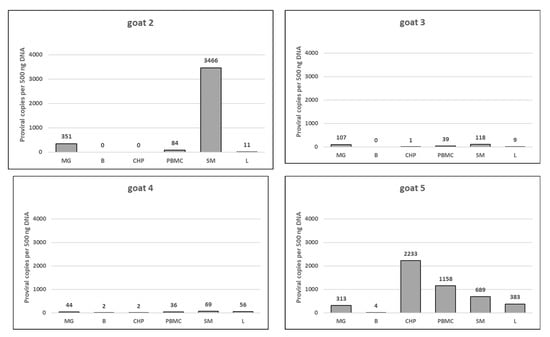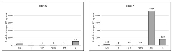 Quantification of SRLV proviral load in different organs and cells of goats analyzed in this study. PBMC—Peripheral blood mononuclear cells, L—Lung, SM—Synovial membrane, B—Brain, CHP—Choroid plexus, MG—Mammary gland. Mean value of SRLV proviral copy number is shown above the bar.