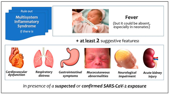 - Agrawal, G.; Wazir, S.; Arora, A.; Sethi, S.K. Multisystem inflammatory syndrome in a neonate masquerading as surgical abdomen. BMJ Case Rep. 2021, 14, e246579. [Google Scholar] [CrossRef]