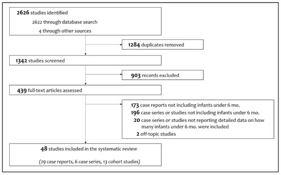 We conducted an extensive search of the following databases (accessed on 10 October 2021): PubMed (https://pubmed.ncbi.nlm.nih.gov/), Scopus (https://www.scopus.com/search/form.uri?display=basic#basic) and Embase (https://www.embase.com/?phase=continueToApp#search). We used the following terms: ((“pediatric” AND “multisystem” AND “inflammatory” AND “syndrome”) OR (“multisystem” AND “inflammatory” AND “syndrome” AND “in” AND “children”)) AND “SARS-CoV-2”. Additional studies were identified by authors based on their knowledge in the field, if not already included by literature search. We excluded (1) all retrieved articles written in non-English language; (2) articles which did not clearly report the number of infants under six months of age.