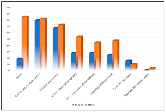 Regarding clinical features, fever is a milestone in older children with MIS-C (99.3%) [59]: we confirmed this trend in young infants with MIS-C (84.4%). Conversely, only the 18.2% of neonates with MIS-N presented with fever, but temperature changes are not a constant finding in the onset of infectious and even in the inflammatory febrile pathologies in preterm and term neonates [60,61]. Therefore, differences in age of MIS-N and MIS-C infants could explain this disparity in fever incidence. Differently from older children with MIS-C, in which gastrointestinal symptoms were the most common manifestation (87.3%) [62], we demonstrated that cardiovascular dysfunction and respiratory distress are the prevalent findings both in neonates with MIS-N and in neonates/infants with MIS-C (Figure 3).