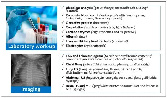 From the diagnostic point of view (Figure 4), although the current diagnostic reference standard for neonatal respiratory distress includes chest X-ray [63], only a third of patients with MIS-N or MIS-C showed pathologic chest X-ray. Recently, Musolino et al. suggested performing lung ultrasound (LUS) in patients with clinical suspicion of MIS-C, or without a certain diagnosis: the finding of many B-lines and pleural effusion would support the diagnosis of a systemic inflammatory disease [64]. Moreover, LUS can also reduce X-ray exposure, but its efficacy as diagnostic tool has been described only in a 6-months-old infant with MIS-C: the authors found an irregular pleural line, B-lines, with bilateral patchy distribution, and small peripheral consolidations [38].