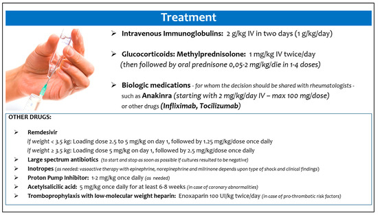 The majority of infants described in the literature received IVIG [11,13,14,19,20,24,25,27,28,34,35,37,38,39,40,42,43,44,45,47,52,53] and steroids (mostly methylprednisolone) [11,14,15,18,22,25,26,28,31,32,34,36,37,38,39,40,41,42,44,45,52]. According to results of a French study, the treatment with IVIG and methylprednisolone vs IVIG alone was associated with a more favourable course among children with MIS-C [18,22,45]. However, data interpretation is limited by the observational design of the study [75].
