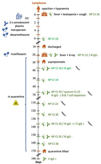 A 60-year-old man presented at the emergency room (ER) of a Belgian hospital with high fever (39.2 °C) and a productive cough. His medical history consisted of type 2 diabetes mellitus, obesity and peripheral vascular insufficiency. Furthermore, he had been diagnosed with a mantle cell lymphoma with paraneoplastic glomerulonephritis for which he needed renal replacement therapy (intermittent haemodialysis). Therapy for the mantle cell lymphoma consisted of six courses of rituximab and bendamustin during a seven-month period. After a PET-CT showed complete remission and his kidney function recovered to a stable eGFR of 25–30 mL/min/1.73 m2 (CKD-EPI formula), maintenance therapy with rituximab had been initiated. The second dose was administered seven days before presentation at the ER (Figure 1). The laboratory showed leukopenia (1.35 × 109/L) with neutropenia (0.96 × 109/L) and remarkable lymphopenia (0.01 × 109/L) (Table 1). SARS-CoV-2 RT-qPCR performed on a NP swab was positive with a cycle-threshold (Ct) of 16.3 corresponding to a semi-quantitative estimation of the viral load of 5.14 × 108 virus copies/mL. A CT-scan on day one showed bilateral consolidations and ground-glass opacifications consistent with the image of COVID-19-associated pneumonia. A six-day course of meropenem (1000 mg twice daily) was initiated to treat possible bacterial pulmonal superinfection. On day one of hospitalisation, the patient developed hypoxemia, requiring nasal oxygen therapy until day five. Cultures of sputum and blood were negative for the growth of bacteria or fungi. Between day one and three, three dosages of convalescent plasma were administered. Dexamethasone treatment (6 mg once daily) was started on day five and administered until day ten. The patient progressively recovered and was discharged on day ten (Figure 1).